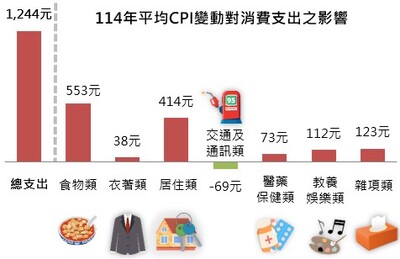 若以每月消費支出約7萬元之家庭為例,就114年平均CPI較上年平均漲1.78%而言,在購買相同品質與數量的商品及服務情況下,平均每月消費支出會較上年增加1,244元;七大類中食物類增加553元,居住類因房租價格上漲而增加414元。
