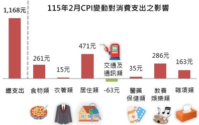若以每月消費支出約7萬元之家庭為例,就2月CPI較上年同月漲1.67%而言,在購買相同品質與數量的商品及服務情況下,平均消費支出會較上年同月增加1,168元;七大類中居住類增加471元,教養娛樂類因國內、外旅遊團費等價格上漲而增加286元。
