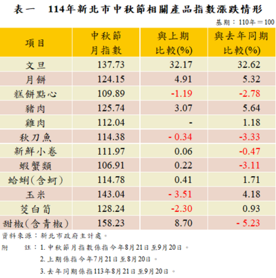【新北市訊】月圓人團圓的中秋佳節,賞月與烤肉乃應景的節慶活動,故市民關切相關食材的價格變動情形。近期新北市境內各應景食材物價指數之變動情形分述如下: