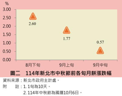 一、今(114)年文旦因颱風重創供量減少,致文旦指數 較去(113)年同期及上期分別漲32.62%及32.17%。月餅因原物料及包裝成本上升,致指數較去年同期漲5.32%;若與上期比較,因節慶需求增加,漲4.91%。而糕餅點心則因部分業者優惠促銷較去年多,致指數較去年同期跌2.78%;另因中秋節將近,部分業者推出優惠促銷,致指數較上期跌1.19%。觀察文旦及月餅於中秋節(10月6日)前各旬指數漲跌走勢,今年文旦於8月下旬(中秋節前40天,即前4旬)因需求偏低,較前一旬跌0.26%,至 9月上旬(中秋節前30天,即前3旬)因量少價高且近中秋節需求增加,故較前一旬漲33.13%,而9月中旬(中秋節前20天,即前2旬)買氣回歸平常水準,故較前一旬回跌1.41%。月餅於今年8月中旬陸續上市後,自8月下旬至9月中旬各旬分別較前一旬漲2.60%、1.77%及0.57%(表一、圖一及圖二)。